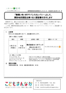4/1付けを以って長野県いきいきアドバンスカンパニーのワークライフバランスコースの認定を頂きました。また4/23に認定書の授与式があり、報道各社様に取材をして頂きました。今回、当社として初の認証となりました。これからも社員の働きやすい環境整備を進めていくと共に、次世代を担う人材づくり、育成を視野にネクストジェネレーションコース、子育て介護支援や女性、障害者、外国人社員が働きやすい環境整備のダイバーシティコースを次の目標として総活躍企業を目指していきたいと思います。